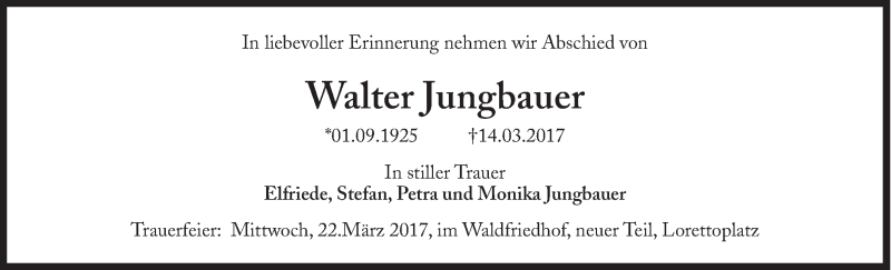 Hier finden Sie alle Traueranzeigen aus der Zeitung, die bisher für Walter Jungbauer erschienen sind. Weitere Traueranzeigen, die in der Zeitung erscheinen, werden hier ebenfalls aufgelistet