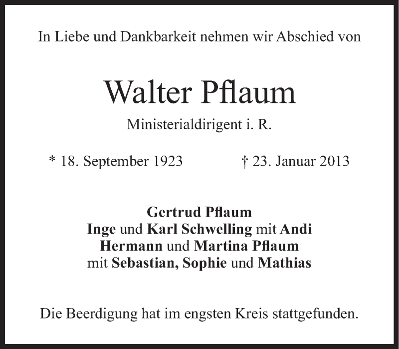 Hier finden Sie alle Traueranzeigen aus der Zeitung, die bisher für Walter Pflaum erschienen sind. Weitere Traueranzeigen, die in der Zeitung erscheinen, werden hier ebenfalls aufgelistet