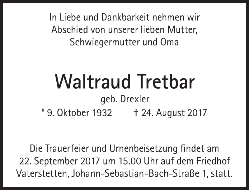 Hier finden Sie alle Traueranzeigen aus der Zeitung, die bisher für Waltraud Tretbar erschienen sind. Weitere Traueranzeigen, die in der Zeitung erscheinen, werden hier ebenfalls aufgelistet