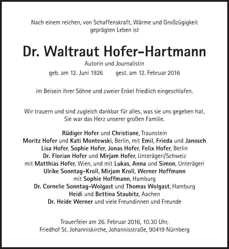 Hier finden Sie alle Traueranzeigen aus der Zeitung, die bisher für Waltraut Hofer-Hartmann erschienen sind. Weitere Traueranzeigen, die in der Zeitung erscheinen, werden hier ebenfalls aufgelistet
