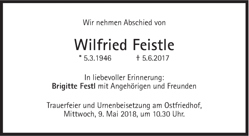 Hier finden Sie alle Traueranzeigen aus der Zeitung, die bisher für Wilfried Feistle erschienen sind. Weitere Traueranzeigen, die in der Zeitung erscheinen, werden hier ebenfalls aufgelistet