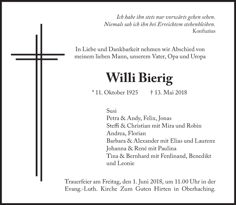 Hier finden Sie alle Traueranzeigen aus der Zeitung, die bisher für Willi Bierig erschienen sind. Weitere Traueranzeigen, die in der Zeitung erscheinen, werden hier ebenfalls aufgelistet