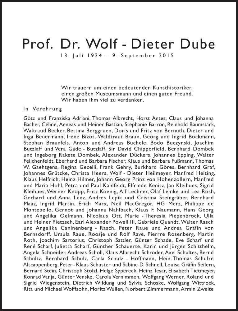 Hier finden Sie alle Traueranzeigen aus der Zeitung, die bisher für Wolf-Dieter Dube erschienen sind. Weitere Traueranzeigen, die in der Zeitung erscheinen, werden hier ebenfalls aufgelistet