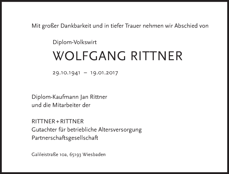 Hier finden Sie alle Traueranzeigen aus der Zeitung, die bisher für Wolfgang Rittner erschienen sind. Weitere Traueranzeigen, die in der Zeitung erscheinen, werden hier ebenfalls aufgelistet