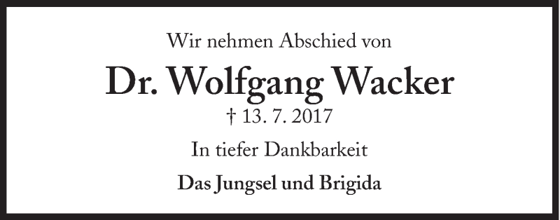 Hier finden Sie alle Traueranzeigen aus der Zeitung, die bisher für Wolfgang Wacker erschienen sind. Weitere Traueranzeigen, die in der Zeitung erscheinen, werden hier ebenfalls aufgelistet