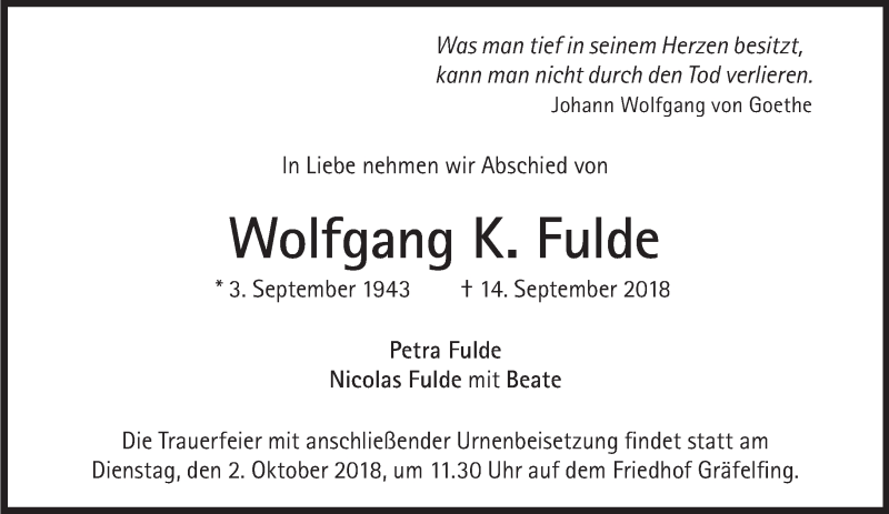 Hier finden Sie alle Traueranzeigen aus der Zeitung, die bisher für Wolfgang K. Fulde erschienen sind. Weitere Traueranzeigen, die in der Zeitung erscheinen, werden hier ebenfalls aufgelistet