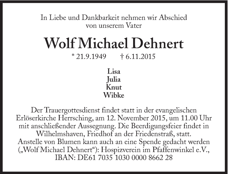 Hier finden Sie alle Traueranzeigen aus der Zeitung, die bisher für Wolf Michael Dehnert erschienen sind. Weitere Traueranzeigen, die in der Zeitung erscheinen, werden hier ebenfalls aufgelistet